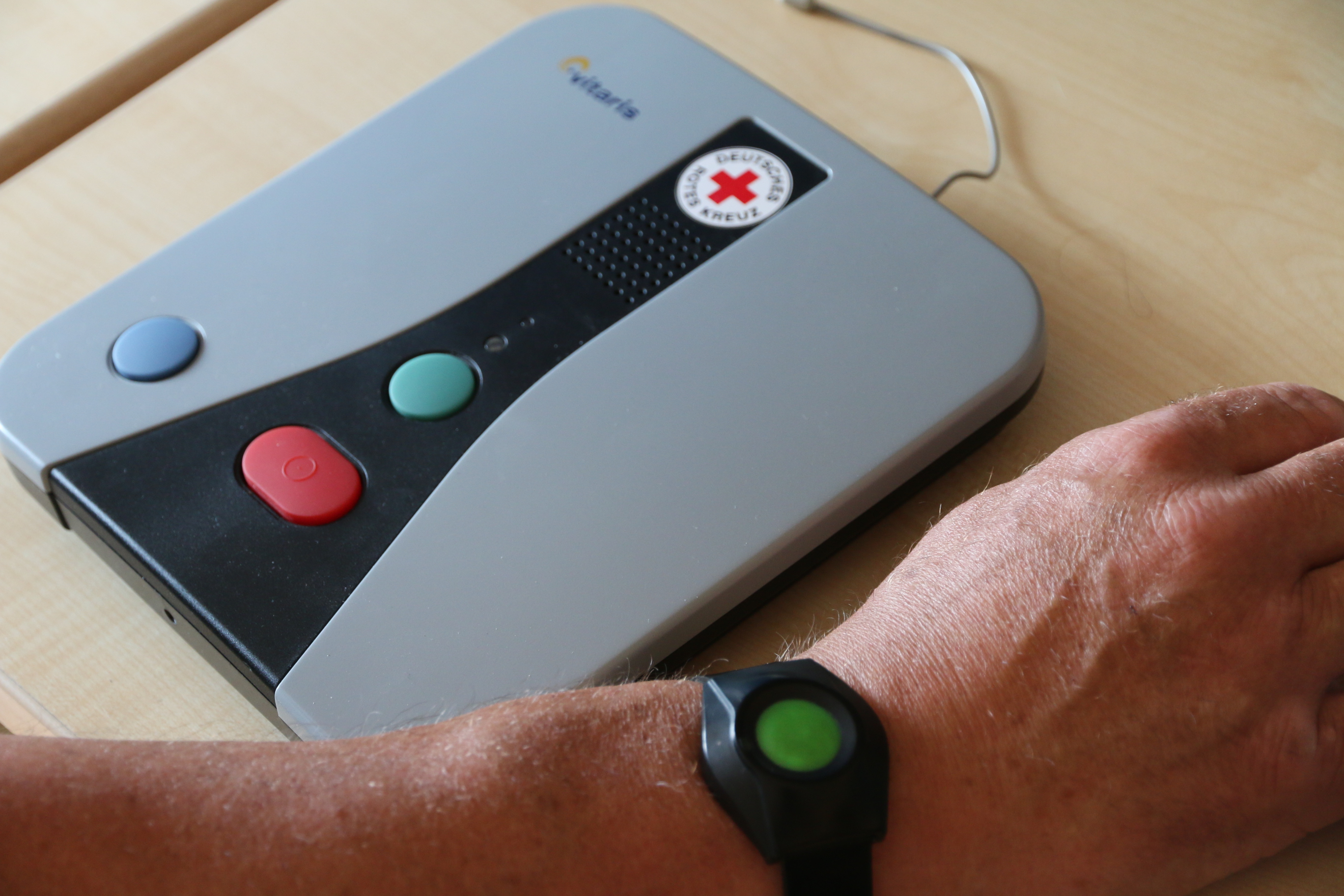 Er sei das einfachste Mittel, um im Notfall Hilfe zu holen. Der Nutzer trage Tag und Nacht ein Armband mit einem Alarmierungsknopf, den er im Notfall einfach drücken könne. Nach seiner Erfahrung kommt es recht häufig vor, dass ein alter Mensch stürzt, zum Beispiel weil er Kreislaufprobleme hat oder nicht mehr hundertprozentig trittsicher ist. Oftmals gelinge es der Person nicht, aus eigener Kraft wieder aufzustehen. „Lebt sie allein, muss sie dort verharren, bis jemand sie findet. Ein Kunde des Hausnotrufs muss nur auf den Notfallknopf drücken und schon kommt Hilfe. 24 Stunden am Tag, 365 Tage im Jahr.“ Die Basisstation ist über das Festnetz mit der Notfallzentrale des DRK verbunden. Die Mitarbeiter dort sehen genau, wo der Notruf abgesetzt wurde, und können im Idealfall mit dem Hilfesuchenden direkt am Gerät Maßnahmen besprechen. Der Notfallsender wiederum, den die Kunden Tag und Nacht tragen, hat eine Reichweite von 30 bis 50 Meter. Per Knopfdruck lässt sich damit ein Notruf absetzen. Kommt keine Rückmeldung, wird eine bei Vertragsabschluss individuell vereinbarte Alarmierungskette in Gang gesetzt. Sie legt unter anderem fest, wer Zugang zu Haus oder Wohnung hat. Viele Kunden haben einen Haustürschlüssel beim DRK hinterlegt, mit dem die Notfallhelfer rasch in die Wohnung gelangen können. Außerdem hat das Rote Kreuz einen Bereitschaftsdienst eingerichtet, der rund um die Uhr Hilfe leisten kann - zum Beispiel beim Aufstehen, wenn ein Kunde gestürtzt ist.