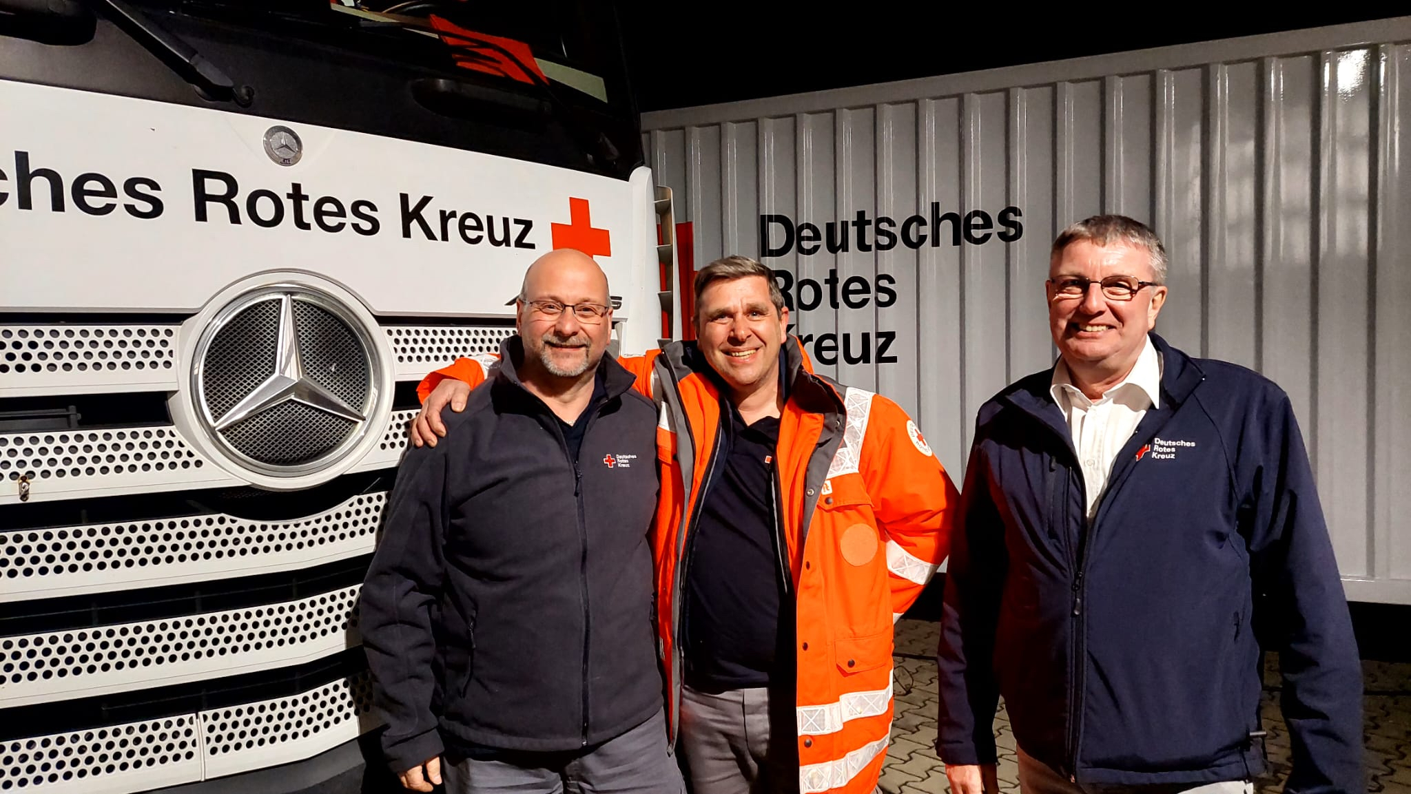 Bei der Rückkunft in der DRK Landesverstärkung in Fritzlar wurden Martin Hansche (links) und sein Teampartner Ansgar Pfeiffer (Mitte) von Jürgen Christmann (rechts), Vizepräsident des DRK Landesverbandes Hessen, begrüßt. (Foto: DRK)