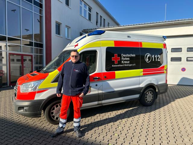 „Didi“ Dietrich Heerdt und "sein" N-KTW. (Foto: André Hübsch, DRK Kreisverband Büdingen)